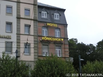 さてホテルはあのへんにあるはず…と見ると、駅前のバス乗り場の向こうに「ホテル・ケーニヒスホフ」と書かれた赤茶色のビルがあった。おいおい、なんだかずいぶん小さいじゃないか、写真で見たときはもっとこう立派な建物だったはずだが…と不審に思いつつホテルの正面に回ると、思っていたより少し小さいけれど写真で見たような構図になった。