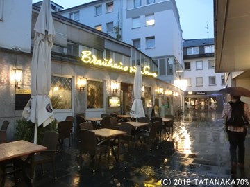 やがて商店街のようなところにさしかかったが、ほとんどの店が閉まっていて、ひっそりとしている。人が来ないから店を閉めたのか、店を閉めたから人がいないのかはわからない。こんな様子ではレストランも閉まっているかも知れないぞ…と不安を感じながら歩いて行くと、「ブラウハウス・ツァー・ゾンネ」があった。店の前にはいくつものテーブルが並べられていて、天気が良ければそこに大勢の客がいるのだろうけれど、さすがのドイツ人も雨に濡れながら傘も差さずに食事を摂る、ということはないようだった。
