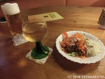 シュニッツェルというのは衣を付けて少なめの油で揚げたカツのようなもので、たいへん日本人好みの料理だ。カリッとした衣に包まれた存在感のある肉がたまらなく旨い。これをいろいろなソースでアレンジするのだけれど、この日のシュニッツェルはキノコソースがかかっていた。それとゴロッとしたフライドポテト、サラダが付いて13.5ユーロ(1700円)。2人で分けたので、実質900円ほどでお腹いっぱいになる。ただしビールは別料金で別腹だ。