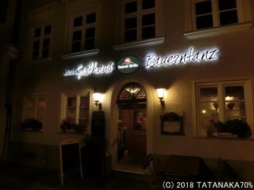 8時を過ぎているので、早いところ晩ごはんにありつきたいところだ。けれどこのホテルは市街地から離れたところにあるので、車を置いて路面電車に乗って街に向かった。僕らの晩ごはんというのは、酒がなければ始まらず、終わらないのだ。車でなんか行くわけにいかないのだ。市街地に着き、細い路地を抜け、バウエルンタンツというレストランに入る。なぜツマはこんな奥まった場所にある地味な店まで把握しているのだ。僕は少し恐ろしくなったけれど、恐ろしいからその店には行かない!などというわけにも行かず、おとなしくツマに従った。