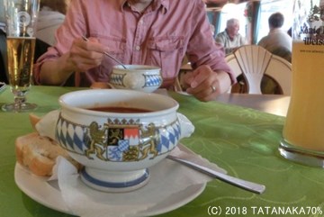 午後2時近くになって、麓まで降りてきた僕らは遅めの昼食を摂ることにした。人が集まるところなので当然のようにレストランがある。少し時間が遅いけれど、それでもほとんど全ての席が埋まっているようだった。僕は車の運転があるのでノンアルコールビールで我慢するけれど、ツマは羨ましそうに上目で睨む僕に遠慮することなく白ビールを注文し、グビリと飲んだ。ツマはビールは苦手だけれど、白ビールは好きなようだ。逆に僕は白ビールのスッキリ爽やかした味とツンと華やかな香りが苦手で、どちらかというとどっしりとした苦いビールの方が好きだ。食事は、このバイエルン地方の名物、グラーシュというビーフシチューにした。バイエルンの象徴、白と水色の菱形で彩られた小さな壺のような器で供されるそれはまさに絶品、こんな観光地に寄生しているレストランなどちゃんちゃらおかしくて、などとは決して言えない、本格的な本物の名物料理なのだった。ここでもまた、僕らはとんでもなく旨い料理を堪能したのだった。だけどねえやっぱりビール飲みたいよビール。