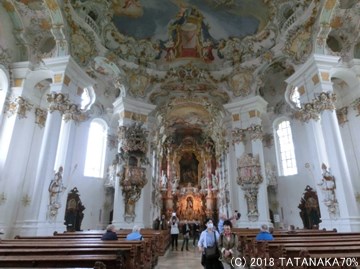 途中、のどかな丘陵地帯を抜け、ヴィース教会に立ち寄る。行ってみるとそれは小さく地味な教会で、なぜこんな所にわざわざ寄るのかと思ったけれど、中に入ってその理由がわかった。内部の装飾が、とんでもなく豪華で美しいのだった。白を基調とした壁面や天井に、淡い色彩で宗教画が描かれている。なるほどこれは一見の価値がある、と僕は頷いた。