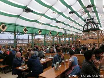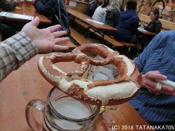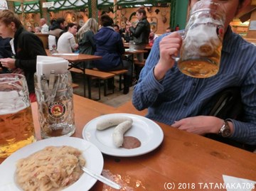 と同時に、売り子がプレッツェルを持って歩いてくる。これは注文して持って来てもらうのではなく、徘徊している店員から直接買うのだ。5.1ユーロ(663円)は少し高い…とは全く思わない。なにしろこのプレッツェルはとても大きくてとてもしょっぱくて、とてもとても旨いのだ。いや旨いのではなく、うまーい!のだ。さらに注文しておいたミュンヘン名物の白ウインナー、ヴァイスヴルストとザワークラウトが届く。ヴァイスヴルストは縦半分に切って皮を残して食べる。これはふんわりとやわらかく、ドイツ料理というとガッシリした肉を食うようなイメージがあったけれど、完全に覆されてしまった。ザワークラウトは、僕らがいつも家でやっているように松戸駅のカルディで買ってきたものを瓶から出してそのまま…というのではなく、粒マスタードを絡めて軽く炒めてある。当然のように、どちらも旨い。いや、違う。うまーい!のだ。すかさず2リットル目のビールを注文する。オクトーバーフェストでは、店を構えている各醸造所がオクトーバーフェスト専用のビールのみを用意しており、「1つちょうだい!」というとビールの種類を聞かれることもなくドデンとジョッキが置かれるのだった。