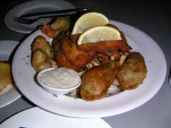 とてもじゃないが、リラックスなんてできない。でもまぁ、他にもう一組の客がいるので、すぐに追い出されることもないだろう。僕らはやや落ち着きを取り戻し、フィッシャーマンズ・バスケットを眺めた。なんだか、ぜんぶ揚げ物のようである。すべてが茶色い衣をまとっているため、中身が何であるかわからないばかりか、見た目にも非常に美しくない。揚げ物は山のように積み上げられているが、すべて2つもしくは4つ6つと偶数になっている。ひょっとして、2人分なのだろうか。たしか、1つだけとオーダーしたつもりだったが。僕は途方に暮れつつ、しかし腹が減っていたので、いちばん手前の大きな塊を小皿に移した。長径10センチ、短径4センチ程度の葉巻型のこれは、何だろう。ナイフを入れてみると、ある程度までは、くにゃりと刺さる。しかし、何か堅いものがあるようだ。どうしても切れないので、あきらめてフォークですくってみた。 それは牡蛎フライだった。ふつう牡蛎フライというと、殻からはずしは身だけに衣をつけ、こんがりと香ばしく揚げるので、ひょいぱくと気軽に食べることができる。しかし殻ごと揚げられたこの牡蛎フライはそういったカジュアルスタイルは決して許さず、ナイフとフォークでお行儀よく伝統的上品フォーマルスタイルで召し上がらなければならないざます。他にはエビやイカ、貝柱など盛りだくさんで、正直うんざりしながらもやはり海辺の町で食べるシーフードは旨く、何とかほぼ完食にこぎ着けたのは22時半頃だった。 支払いを済ませてレシートを見ると、やはりフィッシャーマンズ・バスケットは1つとなっている。牡蛎などが2つずつ入っていたのが1人分なのか、最後の客だからとサービスしてくれたのかはわからなかった。 店を出た僕らは、コンビニに立ち寄って明日の朝飲む牛乳を買い、酒屋で酒を買ってホテルに戻った。 |