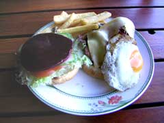 ゆうべのスプリングブルック国立公園と同じように、往きは標識に従って走ればいいので気が楽だ。しかも、ゆうべとは違って明るいので、山道も気楽に走れる。30分ほども走ると周りはすっかり山になってしまい、速度制限も100キロまでとなった。100キロ制限の標識をこんな山の中で見るのは非常に違和感があったが、道の作りがよく、なるほど100キロ程度で走るのがちょうどいい。カーブ手前には「75キロまで落とせ」「65キロまで落とせ」と具体的に書いてあり、その通りの速度にすれば楽に曲がれる。日本では「スピード落とせ」と曖昧にしか書かないから、どのくらい落としたらいいかはドライバーの判断にゆだねられてしまう。その結果、カーブを見誤って、あるいは故意に無茶な速度でカーブに進入し、事故を起こすことになる。はっきりと「○○キロまで落とさないと死ぬかんね」と書けばいいのだ。1時間ほど走ると、小さな集落を通り過ぎた。しばらくすると、エフがタンボリン方面の標識を見つけ、道を間違えたことに気づいた。地図を広げてみると、どうやらさっきの集落が分岐点の町だったらしい。僕は車を反転させ、集落に戻った。 集落には戻ったが、どうにもそれらしい道が見あたらない。あたりには人もおらず、道を聞くこともできない。釈然としないまま、とりあえずは最もそれらしい道に入っていった。すぐにワイナリーの案内板があり、エフはこの道で正しいという。僕はこんなところでワインが作られているということは知らなかったが、ワイン好きのエフはリサーチ済みだったらしい。集落は90号線の両側にだけつつましく身を寄せ合っていただけらしく、道はすぐに寂しくなった。 さらに30分ほど進むと、いよいよ道は細くなり、木々も茂ってきた。両側の木は、ユーカリらしい。野生のコアラがいないかと思ったが、なにせ道路標識の制限速度に従ってかっ飛ばしているので、探している暇はなかった。本当にこの道であっているんだろうか、と心配になりかけた頃、唐突に駐車場とゲストハウスが現れた。オライリーズだ。駐車場に車を止めると、あたりは急に静かになった。他にも数台の車があるが、きゃっきゃと騒ぐものはおらず、おお素晴らしき大自然よ我々は今からその一部となるのだ…というどことなく厳かな空気がそこにはあった。欧米系の人々の、ここだけは見習ってもいい点だと思うので、僕らも大自然よ…と厳かな気持ちになりかけたが、腹がぐうと鳴ってそれを拒んだ。まだ午前11時だったが、僕らは小さなレストランに駆け込んだ。 こんな山の中なのだから軽食くらいしかないだろう、そしてその軽食は我々日本人にとっては重食なのだ...といろいろな意味で悲壮な覚悟をしてメニューをのぞき込むと、なんだかやたらと内容豊富盛りだくさんのメニューだった。正直言って、写真もなく一面文字びっしりのメニューを全て読む気にはなれない。僕はカウンターに行き、店員にハンバーガーか何かないか、と尋ねた。ハンバーガーなら、量的にも問題ないだろう。