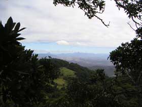 10分ほど歩くと、唐突にツリートップ・ウォークの標識があった。木々の間に渡されたつり橋と聞いていたので、はしごか坂を登ってゆくのかと思っていたが、どうやら谷間をうまく利用しているらしく、坂にはなっていなかった。つり橋の付け根のあたりまで歩いてくると、いよいよ橋の全体像が見えてきた。なるほど、木と木の間を繋ぐように、橋が空中を渡っている。地上からは20メートル以上あるだろうか、見るからに頼りなさげな橋で、6人以上同時に渡るなと書いてある。他に誰も渡っていなかったので、僕らは遠慮なく橋を歩き始めた。20メートルも進むと、橋は大きな木のところで直角に左に折れていた。そこからが本格的なツリートップ・ウォークなのだけれど、その前にひとつイベントがある。この大きな木に取り付けられたハシゴを垂直に登ってゆくと、小さな展望台になっていて森の中を遠くのほうまで眺めることができる。上から2人組が降りてきたので、僕らは彼らが下りきるのを待ってから上った。