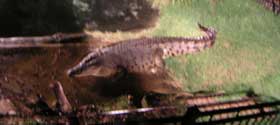仰天である。木の上ばかり注意していたら、突然ワニが現れたという。一体どこから?ガイドの指さす方を見ると、そこにはワニがいた。ただし、川に潜むワニが襲いかかってくるというふうではなく、普通の動物園のようにワニプールがあるだけだった。僕は安堵した。なるほど、危険な動物はこのように仕切られていて、突然襲われるようなことはないらしい。では、コアラやカンガルーなどの愛くるしい動物を探すことにしよう。 ガイドは、ワニについていろいろと説明していた。ガイドは英語でしかも早口なのでよく聞き取れなかった。とにかく今まで見つかった中で一番でっかいワニだよ、と言っていたような気がする。ガイドが肉を持ってきてワニに与えると、ワニはぐわっと食らいついた。