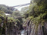 しかし、この高千穂峡もまたすばらしかった。昼の最も強い日差しがさすがに和らぎはじめたころ、勢いよく流れる渓流と蝉の声が、じいじいざあざあじいじいざあざあ、と四方から僕を取り囲んだ。ふうわりと苔むした岩の向こうに、険しく鋭い峡谷を成す大きな岩がきらりと立っている。蝉の声が僕を圧倒し、しかし冷たい風が僕の正気を取り戻す。見上げると向こうの山に現代風の橋が架かっていたが、それがかえってこの場所の時が止まっているかのような錯覚を引き起こさせた。高千穂峡の水流は激しいが、それは確かに止められた時の中を流れており、しかしおそらく季節だけは1分たりとも立ち止まらずに移ろっている。今は鮮やかな緑で覆われたこの峡谷も、あと数週間もすればすっかり秋の様子になってしまうだろう。僕は、いまこの瞬間に立ち会い、夏の高千穂峡を見送っている。そう思うと、はじける飛沫のひとつひとつまでもがとても愛おしく思えた。高千穂峡を後にすると、青雲橋に向かった。今日の宿泊地・延岡までの道の途中、高千穂峡から30分ほどのところにあるので、これは都合がいい。 この青雲橋というのは、東洋一のアーチと言われている。東洋一、というのはとても曖昧だが、具体的に言うと高さ137m、長さ410mだ。もっとも、この橋が東洋一と呼ばれているのはその高さだけが理由ではない。 普通、鉄橋というと地面もしくは川面まで柱があり、その上に道路もしくは線路が敷かれ、さらにその上に鉄骨のアーチがあり補強しているという、なんというか実用重視強度抜群の無骨な姿をしている。しかしこの青雲橋は、川をまたぐようにアーチが渡されているだけで、その下に足は無いし、橋の上は真っ平らとなっている。車で渡ってしまえばなんと言うこともないふつうの道路だが、少し離れたところから見ればその美しく力強いアーチがまっすぐな橋面を支えている姿がすばらしい。美しいけれど、谷の間に架けられた橋、というよりも、2つの山をつないだ橋、といった大胆な様子でもある。日本一という言葉にはある程度の安っぽさがあるが、東洋一となると妙な信憑性がある。世界一となるとホラ吹き呼ばわりされかねないから、大変バランスのいいところでこの橋は東洋一と言われている。 ところで、僕は青雲橋というものをまったく勘違いしていた。青雲橋は高千穂鉄道が通る橋で、その橋を通るとき、列車は速度を落とし乗客に景色を楽しませる。そう思っていた。実際、どこかの鉄道のどこかの橋でそういったことをしていたはずだ。時間があれば、一駅だけ高千穂鉄道に乗り、橋を渡ってみようと考えてもいた。 しかし、青雲橋を見てみると、どうもなんだか車が走っている。確かにかなり高く立派な鉄橋だが、やっぱり車が走っている。あわててガイドブックを見ると、高千穂鉄道は橋の下、ぜんぜん別のところを通っているらしい。で、青雲橋の下を通るとき、速度を落として乗客に青雲橋を見せるのだそうだ。なるほど、橋から見下ろすと、少し離れたところに鉄道の線路があった。 とんでもない勘違いだった。 青雲橋を渡るという目的は達したが、もちろん喜ぶべきことではない。 がっかりした僕は、少し早かったが延岡に向かった。 18時過ぎ、ホテルにチェックインしてひとしきり部屋の狭さに驚いたあと、ありえないほど狭い風呂を見て気を失い、目を覚ましてからまだ明るい町に出た。このあたりは、僕の住む千葉に比べて日没が遅い。 延岡の町は、典型的な現代風の寂れ方をしていた。つまり、コンビニが数件立ち、食料・本・酒はすべてコンビニに集約されてしまい、もともとそれらを扱っていた店はシャッターをおろす。コンビニが扱っていないもの、つまり、パチンコ屋と服屋と居酒屋と薬屋だけがぽつりぽつりと営業している。 コンビニに食われてしまった町ほど寂しく見えるものはない。すべてが灰色で、パチンコのネオンだけがぎらりぎらりと僕を睨みつけている。 僕は、逃げるようにホテルに戻った。