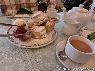 カモを見ているとなんだかおいしそうに見えてきたので、ややこれはひょっとして腹が減っているのではないかと時計を見ると、やはりちょうど正午になろうというところだった。ツマはクリームティーを食べようという。僕はホイップクリームの入った紅茶のようなものを思い浮かべ、いやいやそんなもので腹がふくれるわけがない、軽い昼ごはんといえどなにか固形のものを食べたいと言ったが、クリームティーというのはスコーンと紅茶のセットで、簡易版アフタヌーンティーだとツマに教えられた。