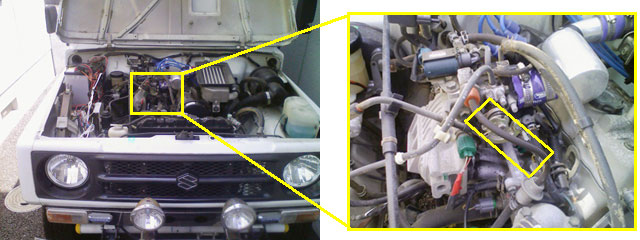 このホースは、写真の黄色で囲んだ部分。JA11の場合、ホースの端に赤いキャップのような物がついているので、それが目印。
