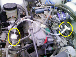 で、メーターに付属の三叉を割り込ませてホースを分岐させます。(写真右の丸)