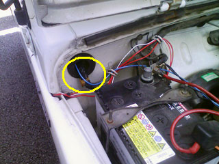 信号線は、写真の青い線。このゴム穴が車内に繋がってますが、このゴム、ベトベトしてなんだかとても不快なので、その左の赤い線のように、ボディーとドアの継ぎ目に通してもいいと思います。