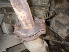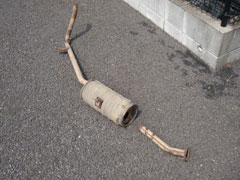 まずは、フランジに張り付いているガスケットを外します。 あまり錆びていると、どれがガスケットやらわからないと思いますが…。 ガスケットを外したら、真鍮ブラシで錆びを削り落とします。まあ、芯まで錆びてるのでそこそこに。 あとは新しいマフラーを取り付けるだけ。 車の後ろからまっすぐ入れるので、アクスルに新聞紙などを巻き付けて保護します。マフラーをここに乗せてスルスルと入れます。 まずフランジ側を針金などで軽く固定し、次にマフラー後端を持ち上げて吊りゴムに固定。最後にまん中を吊りゴムに固定します。たぶんこの順序がいちばん楽。 吊りゴムは、いったん車体から外した方が早いかも。 最後の最後に、フランジにガスケットを挟み、きつーくボルト締めして完了です。