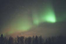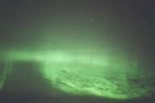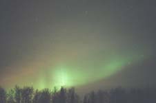 24時00分。ぼんやりとした緑色の光が見えた。それは急激に成長しはじめた。 右の方の空にも、同じような光。 来るか? そう思った瞬間。 2つの光が、鮮やかに波打って広がり、繋がった。 僕は夢中でシャッターを開けた。 1、2、3、4、5! 5秒カウントし、シャッターを閉じる。 揺らめいている。光り輝いている。 強い光のかたまりが左から右へすらりと飛び移る。 1、2、3、4、5! 5秒カウントし、シャッターを閉じる。 ふっ、っと、オーロラは消えた。あっという間の出来事だった。 僕は全身の毛が逆立つのを感じながら、カメラをのぞき込み、フィルムを確認した。あと何枚ある?だいじょうぶ、まだ十分残っている。レンズも曇っていない。三脚もしっかり固定してある。