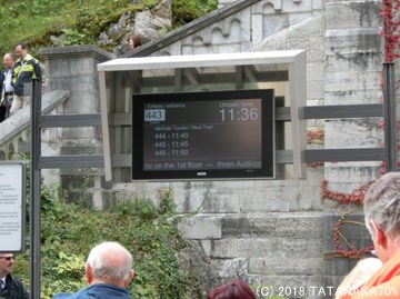 城に行くには、かなりの坂を登らなければならない。しかし2.6ユーロ(338円)で乗れるバスが出ているので、そのチケットも購入。城の前の広場に着き、しばらく待つ。広場には電光掲示板があり、自分のツアーまであとどのくらいか知ることができる。こんな、と言ったら失礼だけれど、こんなロマンチック街道のどん詰まりの端っこにあるくせに、妙にシステマチックで現代的なのだ。
