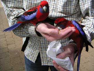 ウォーキングトラックに向かうと、子供達が鳥に襲われていた。いや、正確には餌付けなのだけれど、子供の肩や頭に大きな鳥が群がっている様は、どうにも襲われているようだった。たしかに、ここでは鳥の餌付けができることは知っていたが、あまり興味はなかった。しかし、この光景を見た僕とエフは顔を見合わせ、無言で頷くと駆け足でレストランに戻り、鳥のえさを買った。$1で、手のひらに余るほどの袋に入ったエサが買える。餌付け場に戻ると、まだ鳥がたくさんいた。手のひらにエサを取ると、赤やら青やらのカラフル南国調の鳥が腕に乗り、エサをついばみ始めた。尻尾まで入れると30センチほどある鳥で、こちらに向かって飛んでくる様はとても迫力があるが、まったく無警戒に頭や肩、腕に乗ってくるのでこれはもう可愛くてしかたない。他の観光客は、鳥まみれになっている僕らを見て楽しそうに笑っている。なんだかもう、無邪気で平和で幸せな空気があたりに充満していて、僕らもきゃっきゃとはしゃいでしまった。遠巻きにして写真を撮っている老夫婦がいたので、「あんたらもやりなさいよ」とエサを分けてあげると、老夫婦もたちまち鳥にまみれた。 ひとしきり楽しみ、エサはまだ残っているけれど、森の中を散策することにした。いつの間にか、午後1時を過ぎている。 |