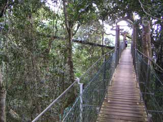 10分ほど歩くと、唐突にツリートップ・ウォークの標識があった。木々の間に渡されたつり橋と聞いていたので、はしごか坂を登ってゆくのかと思っていたが、どうやら谷間をうまく利用しているらしく、坂にはなっていなかった。つり橋の付け根のあたりまで歩いてくると、いよいよ橋の全体像が見えてきた。なるほど、木と木の間を繋ぐように、橋が空中を渡っている。地上からは20メートル以上あるだろうか、見るからに頼りなさげな橋で、6人以上同時に渡るなと書いてある。他に誰も渡っていなかったので、僕らは遠慮なく橋を歩き始めた。20メートルも進むと、橋は大きな木のところで直角に左に折れていた。そこからが本格的なツリートップ・ウォークなのだけれど、その前にひとつイベントがある。この大きな木に取り付けられたハシゴを垂直に登ってゆくと、小さな展望台になっていて森の中を遠くのほうまで眺めることができる。上から2人組が降りてきたので、僕らは彼らが下りきるのを待ってから上った。