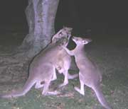 第11話:2日目E・暗黒の密林カランビン・ワイルドライフサンクチュアリには、迷うことなく着いた。なにせこのあたりに大きい道はM1(高速道路1号線)の他にはこの●号線しかなく、トローラー・シーフードレストランもワイルドライフサンクチュアリもこの道沿いにあるので、大きな看板さえ見逃さなければ迷うはずがない。 カランビン・ワイルドライフサンクチュアリの駐車場が見つからず、近くの住宅地の道路の駐車スペースに車を止めた。付近は人影もなく、こんなところに車を止めておいて大丈夫かと少し心配だったが、時間もなかったので駐車場を探すことはあきらめた。 カランビン・ワイルドライフサンクチュアリの正面ゲートから入ると、係員が待っていた。「ナイトツアーか?」と聞かれたのでそうだと答えると、「まだ送迎バスが来てないので中で待っててくれ」と言われた。僕らはレンタカーがあるので送迎バスを断っていた。それだけで30ドル近く安くなるのだから当然だろう。やがてバスが到着し、日本人家族が1組、中国人のグループが1組、おそらく地元の人たちのグループが数組現れた。 ある程度人が集まると、ガイドが蛇を連れて現れた。これはつまり蛇を首に巻いて写真を撮るのだなと思っていると、まさにその通りだった。僕は断ったがエフは写真を撮ってもらっていた。たぶん後で買わされるのだろうが、買わずに済むように僕のカメラでも撮っておいた。 いよいよナイトツアーが始まった。 僕とエフは、「いよいよこれから夜のジャングルに突入するのだ、もし朝になっても帰ってこなかったら捜索願を出してくれ、しかしついに僕らが帰ることがなかったとしても悲しむ事なかれ、僕らは永遠に君たちの心の中でこの大自然と共に生き続けるのだ...」と悲壮な決意を持っていたのだが、どうも周りを見るとみなわいわいきゃっきゃとお気楽である。僕は皆がこれから遭遇するであろう運命を思うと心を痛めた。なにせ夜のジャングルなのだ、この中から1人2人は凶暴な牙を持った得体の知れない動物の餌食になってしまうだろう。 ガイドの後について、まずはいったん園から出て、道路を渡った反対側のゲートから再入園する。ゲートには厳重に鍵がかけられていた。ゲートをくぐると再びゲートは閉められた。ここから猛獣が逃げ出したらゴールドコースト中が大パニックになってしまうだろう。 僕は両脇の木々の上に注意した。何者かが我々を狙っているやもしれぬ。襲いかかられてから気づいても遅いのだ。しばらく歩くと、突然ガイドが叫んだ。「ワニだ!」