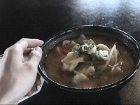 僕は運ばれてきただご汁を見て、ううむと小さく唸った。だご汁は、味噌汁ではなかった。味噌仕立てで具だくさんのすいとんだった。なるほど、小麦粉を水でこねて丸めて味噌汁に入れたらこうなるだろう。店員の説明はあながち間違いではない。が、問題なのはその量だった。予想の(つまりはふつうの味噌汁の)5杯ぶん程度はあった。だって、すいとんなんだから。主食になり得るんだから。僕は、主食のたかな飯と主食の味噌すいとんを食べるはめになってしまった。注文したときに店員がちょっと驚いた顔をしたのはこのためだったのか。言ってくれよ。そういうことは。量はさておき、味は良かった。というか、まったく普通の家庭料理で、たぶん自分で作っても同じような味になるだろう。 ところで、レシートには「ダゴジュル」と書いてあった。だご汁を現地では「ダゴジュル」と発音するらしいが、若い店員も「だごじる」と言ってたしなぁ。どうもやっぱり方言的な発音というのは徐々に消えつつあるらしい。